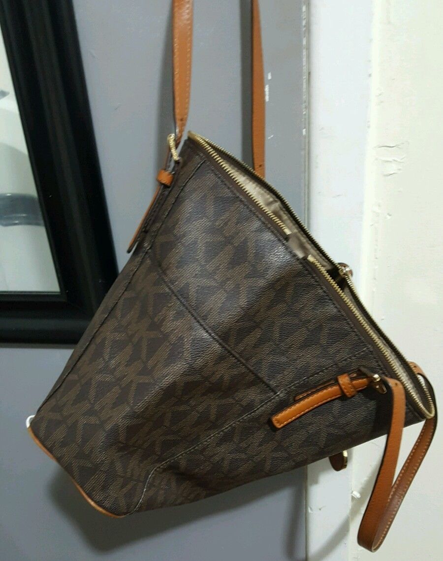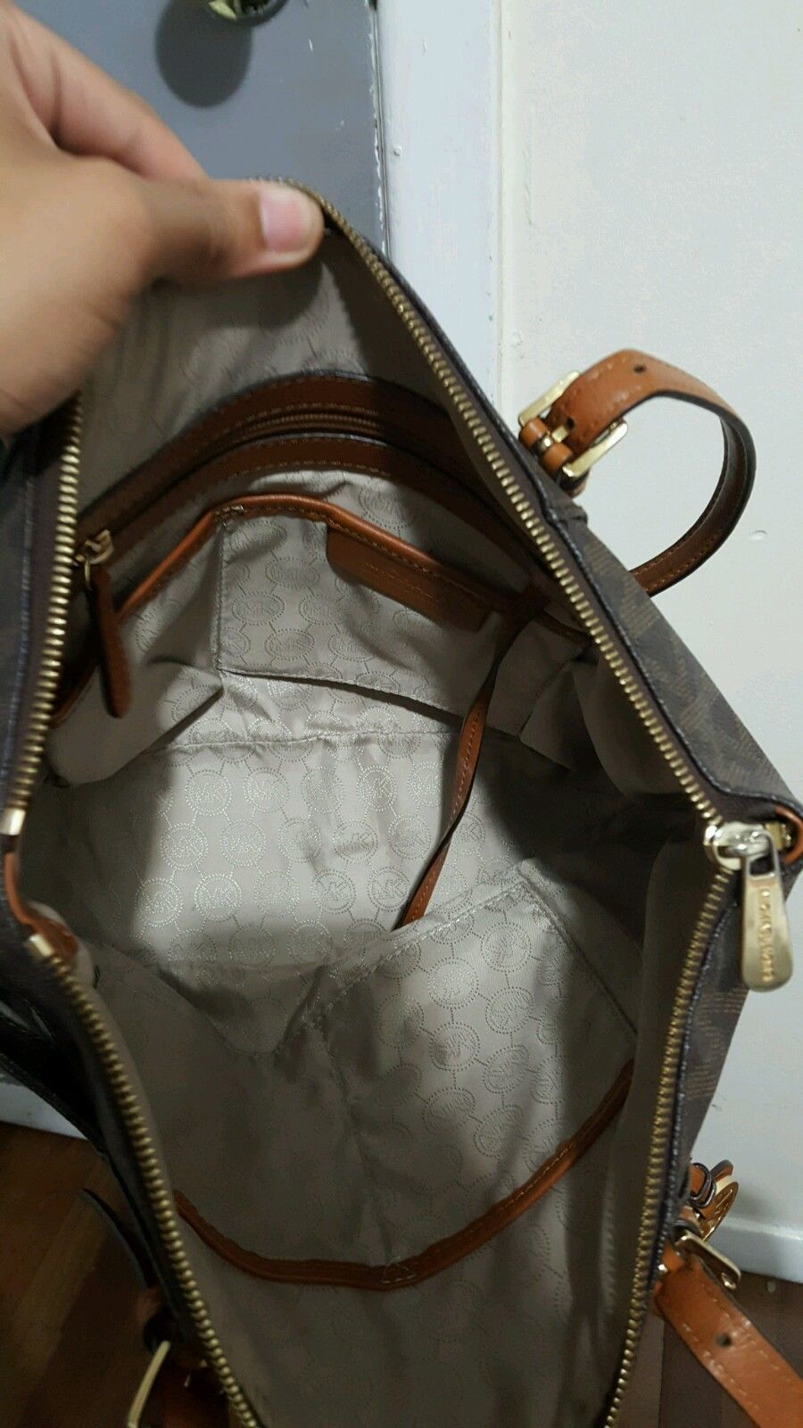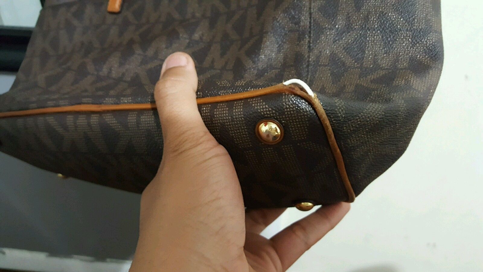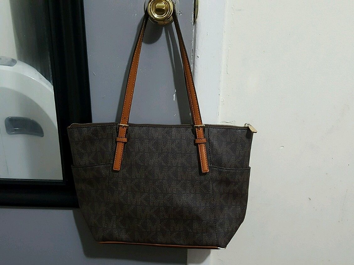 Up to auction is a used Michael Kors Riley large Satchel. please look at all photos before bidding.This chic MK bag is made of MK logo monogrammed PVC, trimmed with full grain leather, and accented with gold tone hardware. It features a slide in back pocket, bottom feet, and a detachable & adjustable strap for shoulder and crossbody carrying.